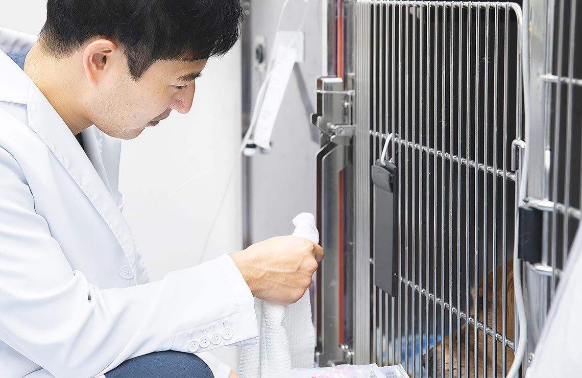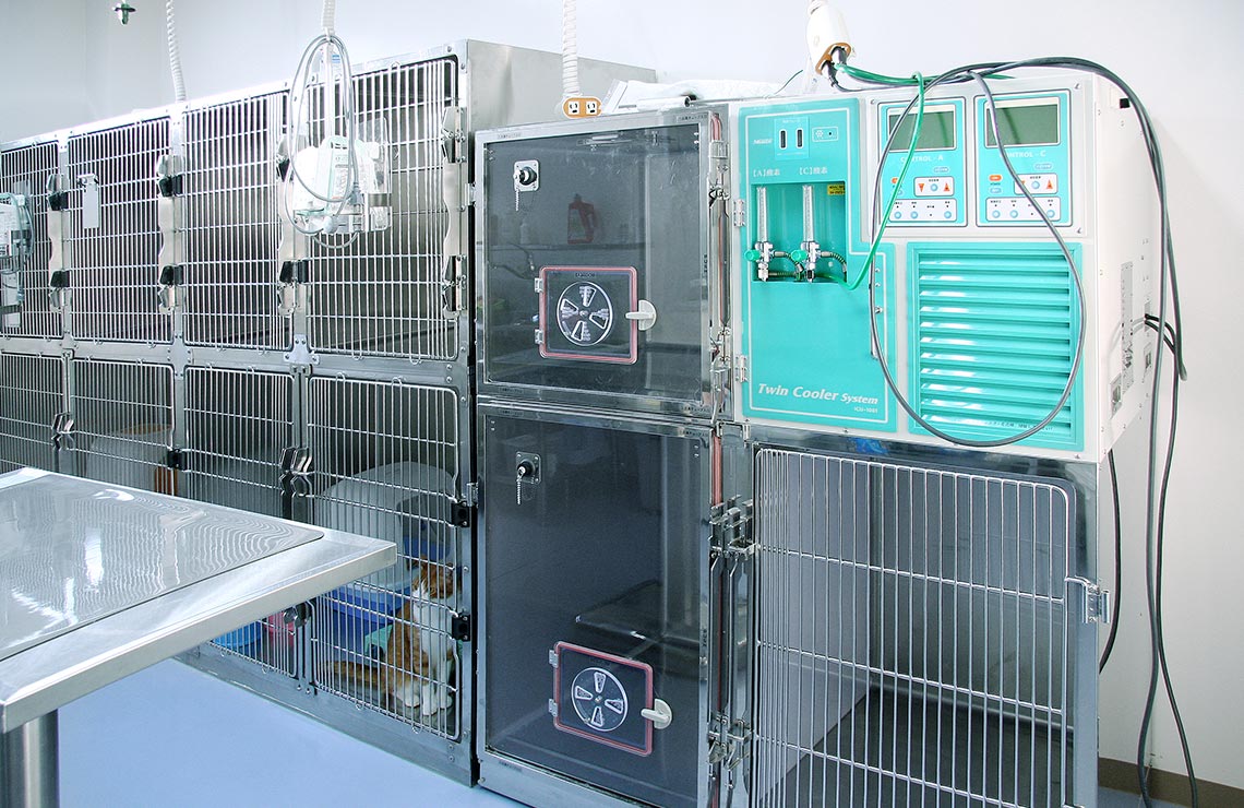 一時入院室は処置室に隣接し、飼い主さんから検査や処置のために一時的にお預かりした症例を管理する施設です。抗がん剤などを点滴投与する時にも使用しています。