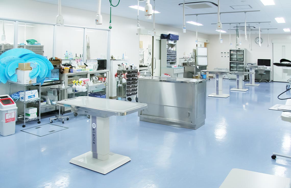 診察をした後、動物は診察室と連続している処置室に移されます。処置台は6台配置され、浴槽のついた処置台もあります。吸入麻酔装置が常備してあり、麻酔下での生検や簡単な外科処置も可能です。また、電子カルテシステム端末を2台設置して、診療の効率化を図っています。薬品、注射器・注射針、その他外傷の処置などに必要な消耗品はコンパクトに整理整頓して、処置室が有効に使えるように心がけております。