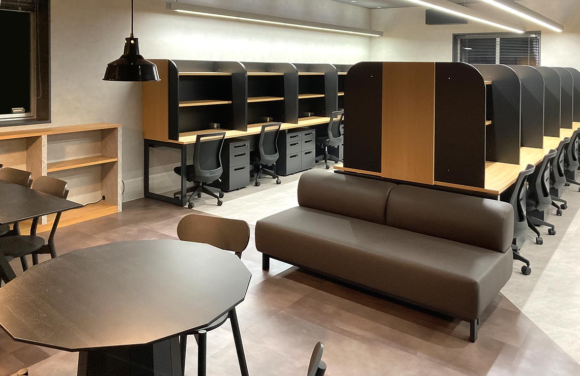 当院の医局には、各勤務医専用のデスクに加え、ソファやテーブルを備えた共有スペースが設けられています。落ち着いた雰囲気の中で、診療科の枠を超えた症例のディスカッションや情報交換が活発に行われ、日々の診療や研究の発展につながっています。また、リラックスできる空間として、日常の会話や交流の場としても機能しており、円滑なチーム医療の実践を支えています。