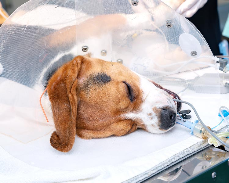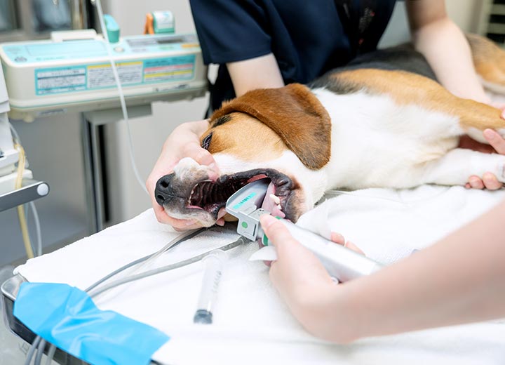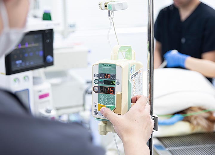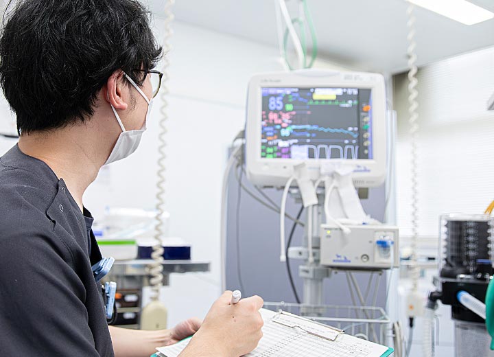 各診療科で検査や手術を受ける動物達の麻酔を担当しています。動物達の不安や痛みを取り除くことを目標に、バランス麻酔の概念に基づいて麻酔薬・鎮痛薬・筋弛緩薬を組み合わせた麻酔を実施しています。基礎疾患があるために麻酔のリスクが高い動物達に対しても、使用する薬剤をよく検討し、なるべく安全な麻酔ができるような対応をしています。術後疼痛管理に関しても積極的に取り組んでおり、動物達の状態に応じた管理をおこなっています。